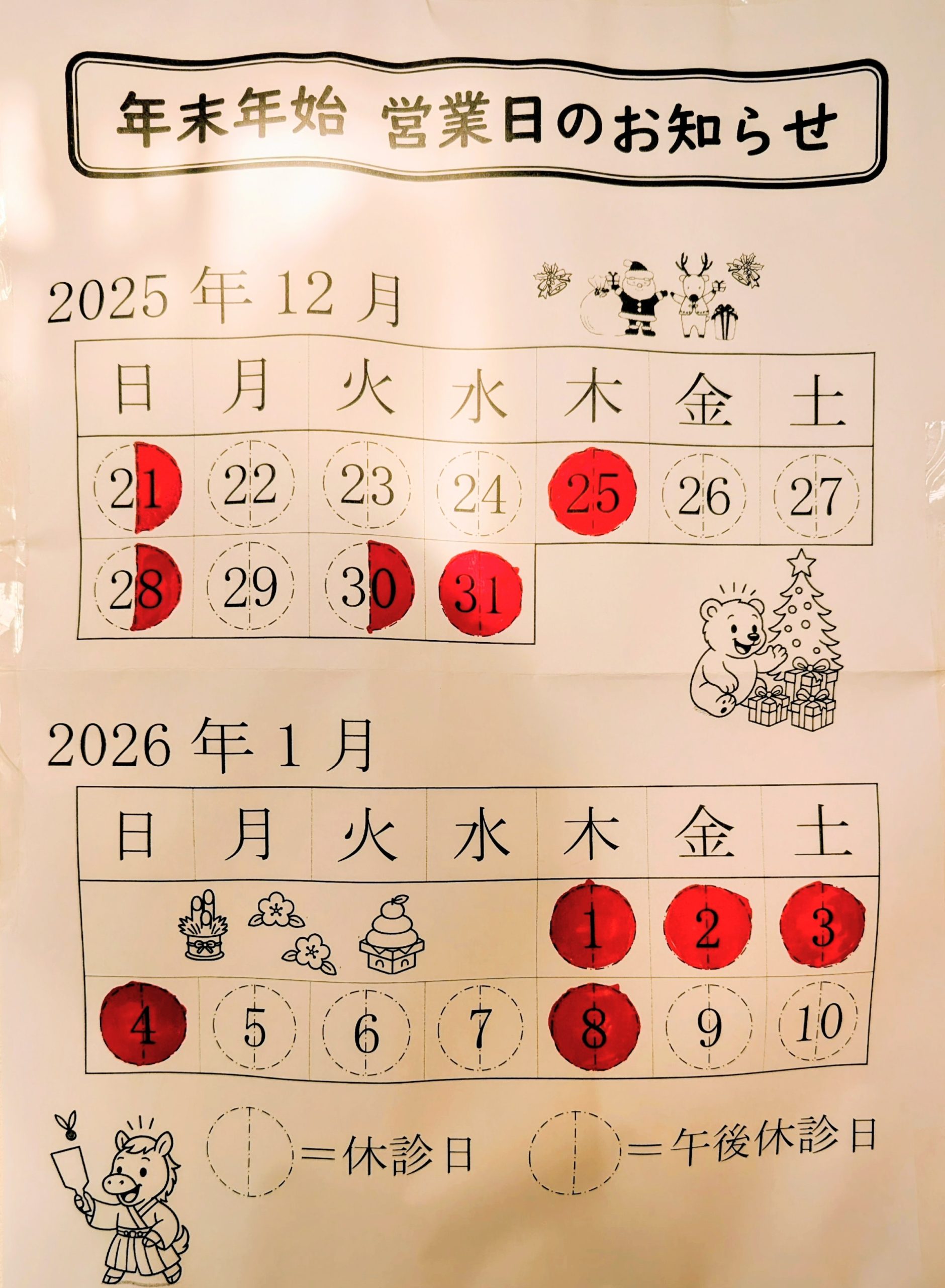 当院は、2025年12月30日(火)午後から2026年1月4日(日)まで、年末年始の休業とさせていただきます。期間中はご不便をおかけいたしますが、何卒ご理解のほどお願い申し上げます。新年は1月5日(月)より通常どおり施術を開始いたします。お身体の不調やメンテナンスをご希望の方は、年内の早めのご来院をおすすめいたします。今年も多くの患者さまにご来院いただき、心より感謝申し上げます。来年も皆さまの健康づくりを全力でサポートしてまいります。